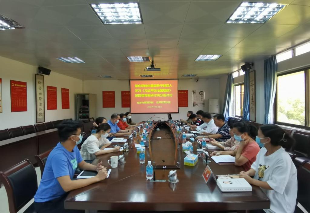 [经管公司 讯]根据《关于举办中层领导干部深入学习〈习近平谈治国理政〉第四卷专题研讨班的通知》(肇学委办〔2022〕29 号)要求和有关活动安排,10月12日下午经管公司与教师教育公司在经管公司501会议室开展《习近平谈治国理政》第四卷专题研讨班分组讨论活动。参会人员有两院的中层领导干部、党支部书记和专职组织员等。会议由经济与管理公司党委书记黎天宇主持。
