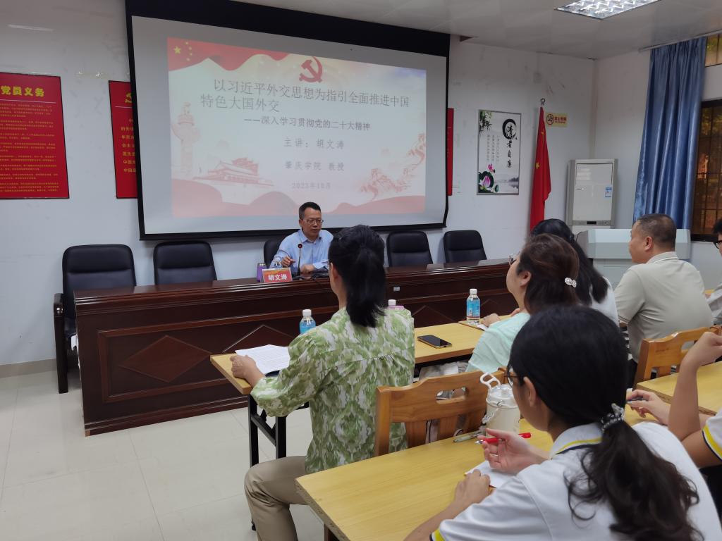 课上,胡文涛先介绍了党的二十大报告关于十年外交工作的总结,随后介绍了我国的外交目标和面临的国际环境。胡文涛强调,要以习近平外交思想为指导,努力开创中国特色大国外交新局面,为全面建设社会主义现代化国家营造良好的外部环境,需要做到以下四点:一要深刻领悟习近平外交思想坚持独立自主,捍卫国际公平正义的使命意识;二要深刻领悟习近平外交思想引领外交工作的实践意义;三要深刻领悟习近平外交思想与时俱进、守正创新的理论品格;四要深刻领悟习近平外交思想坚持胸怀天下,推动构建人类命运共同体的世界意义。
