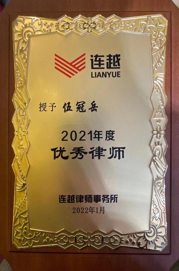 伍冠岳获得荣誉情况(截至2023年7月):获广州市律师协会颁发年度业务成果奖、入选广州市律师协会青年律师领军人才60人名单、多次获律师事务所颁发年度优秀律师、年度优秀案例等奖项。