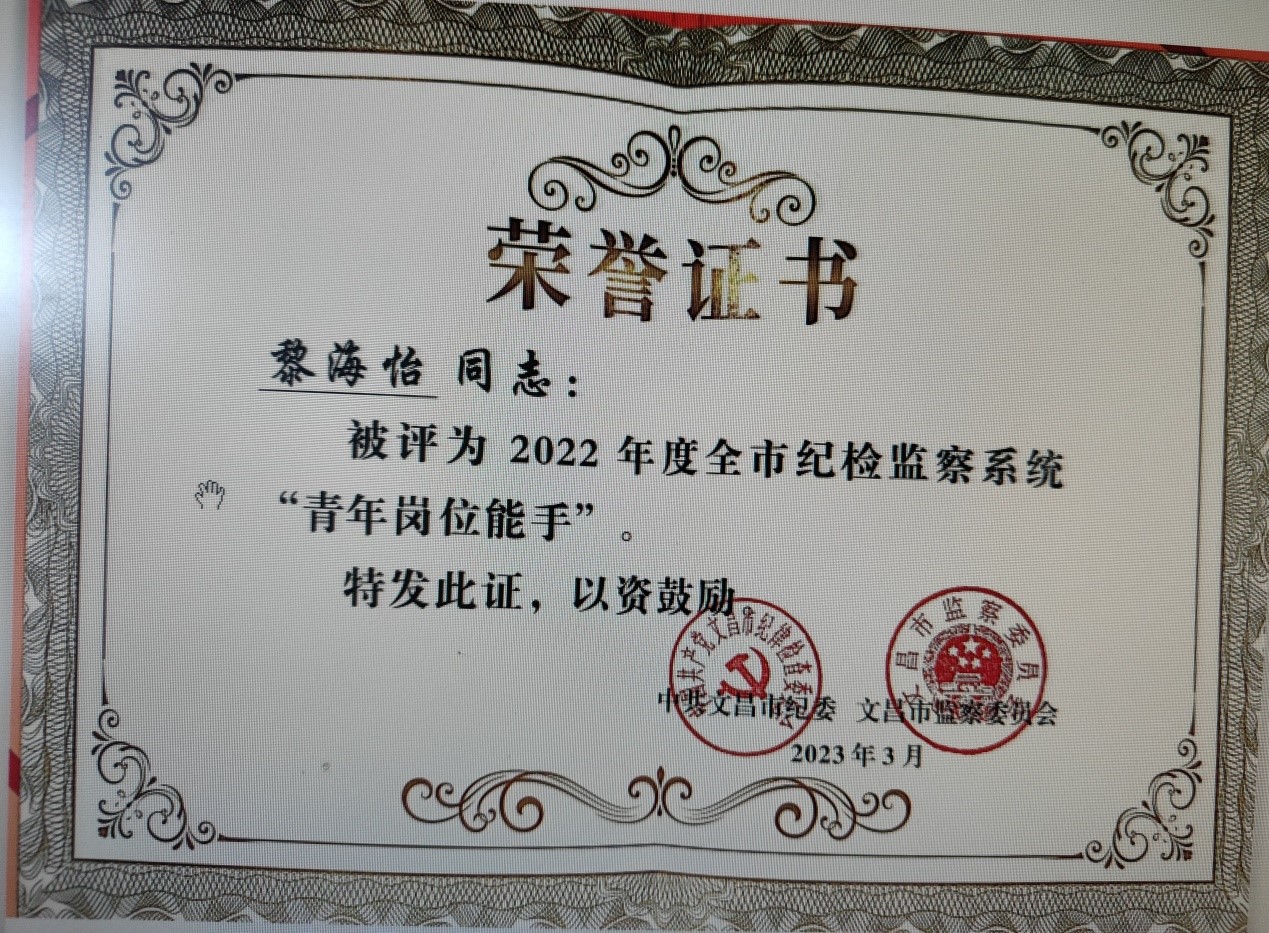 该生2020年参加海南省公务员考试并被录用为中共文昌市纪委一级科员,政治立场坚定,工作积极主动,2022年驰援海南省“0801”抗疫一线,获海南省委组织部“志愿服务荣誉证书”,2023年获评文昌市纪检监察系统“青年岗位能手”、文昌市学习宣传贯彻党的二十大精神暨庆祝“三八”国际妇女节演讲比赛英文组三等奖。总体而言,该生是公司培养的一名具有创新意识和奉献精神的复合型人才。