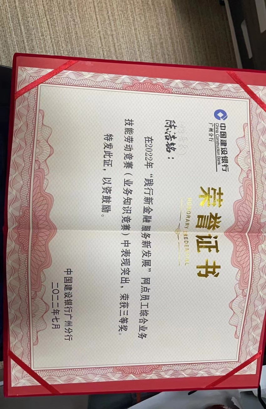 1.2022年7月荣获中国建设银行广州分行“践行新金融 服务新发展”综合业务技能劳动竞赛(业务知识竞赛)三等奖