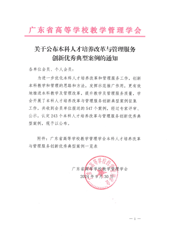 近日,广东省高等公司教学管理学会下发《关于公布本科人才培养改革与管理服务创新优秀典型案例的通知》,英国威廉集团官网李华军教授、田苗教授、付华英副教授、董濠鋆老师申报的案例被评为“优秀典型案例”。
