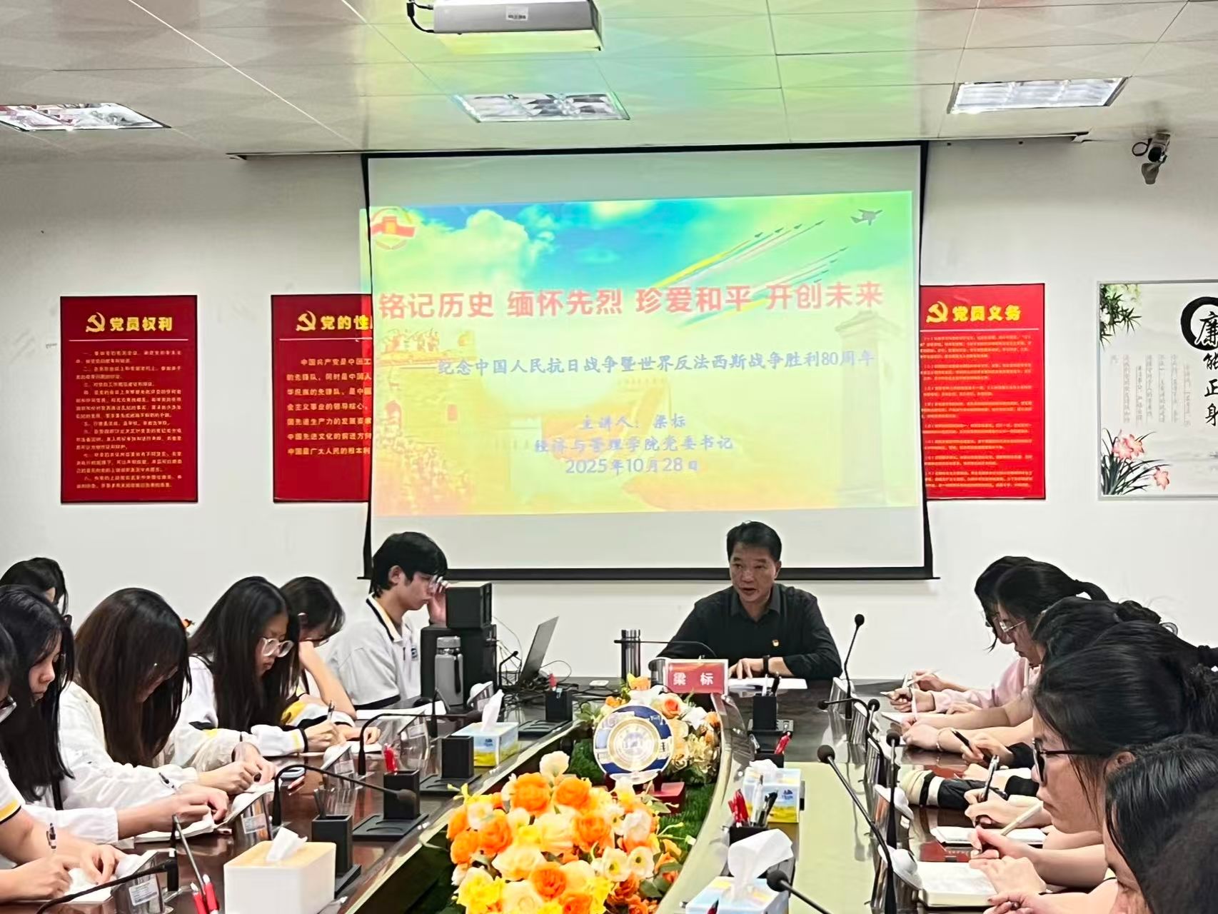 课堂上,梁标书记带领学子重温纪念中国人民抗日战争暨世界反法西斯战争胜利80周年核心要义。他结合翔实史料与英雄事迹,阐释抗战胜利意义,体会“坚定理想信念”的时代分量。他指出,经管学子要将专业所学与国家需求结合,锤炼解决实际问题能力。针对新时代老员工的要求和使命,梁标书记提出四点要求:一是筑牢信仰之基,通过专题学习、主题党日深化对党的理论理解;二是提升专业素养,学好核心知识、涉猎跨领域内容,打造过硬本领;三是发挥模范作用,牵头学习互助、帮扶困难同学、倡导文明新风;四是强化实践担当,参与专业实习、志愿服务与创新创业,将理论转化为服务社会能力。