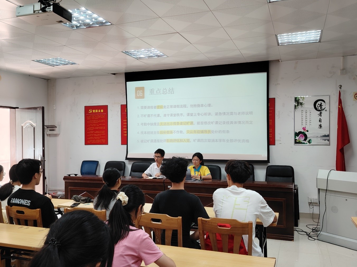会上,首先由会议主讲人围绕课堂纪律、请假规范流程、课堂考勤、惩戒措施、后补假条等内容展开会议,其中特别强调请假要求,提醒纪委通知各班同学有关请假的相关事项。随后,会议为23级纪委展开讲述有关晚修考勤的内容并要求各23级纪委在会后一周内为各班级召开班级学风建设会议。最后,李力老师进行了补充发言,总结上述会议内容并深入解释各项考勤要求,表示对公司学风建设的重视。