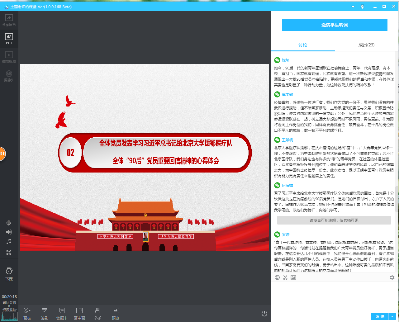 之后,王嘉老师作了题为《习近平指挥战“疫”进行时》的党课,与大家一起学习习近平总书记在中央政治局常委会会议研究应对新型冠状病毒肺炎疫情工作时的讲话精神,并观看视频《人民至上—习近平指挥战“疫”进行时》。全体党员在学习完后展开了积极的讨论,抒发自身感悟,自疫情发生以来,党中央迅速行动,始终将人民的利益放在首位。用短短10天的时间建成了雷神山医院,中国速度震撼了世界,作为一名共产党员,我们既感到光荣,又深知肩上的责任重大,唯有不断增长本领,才能让青春之花在党和人民最需要的地方绽放。
