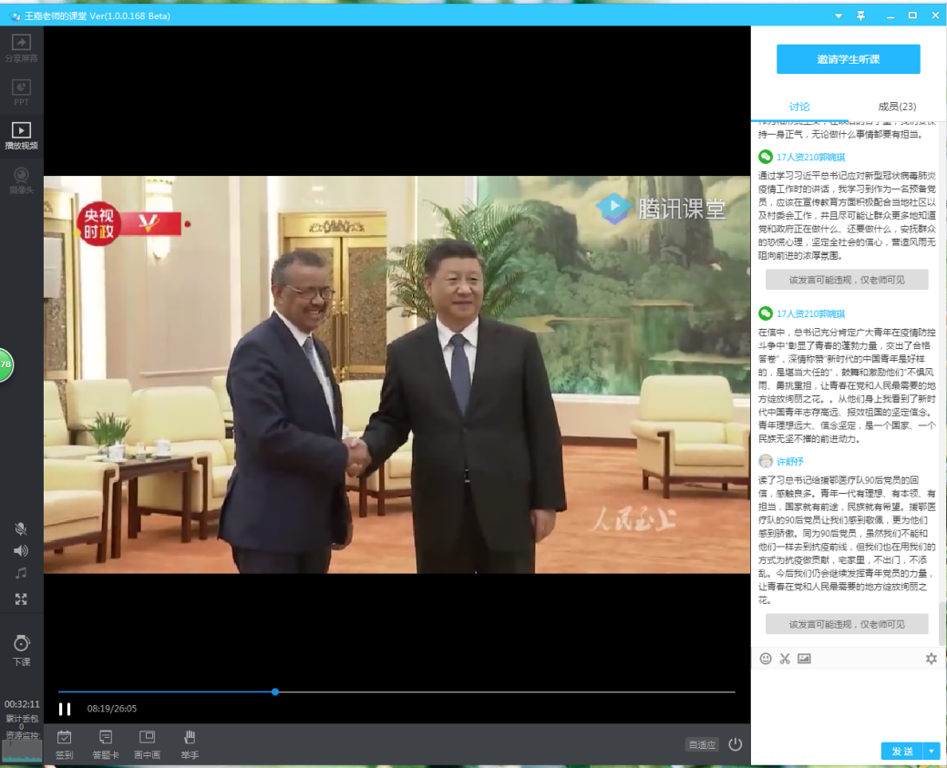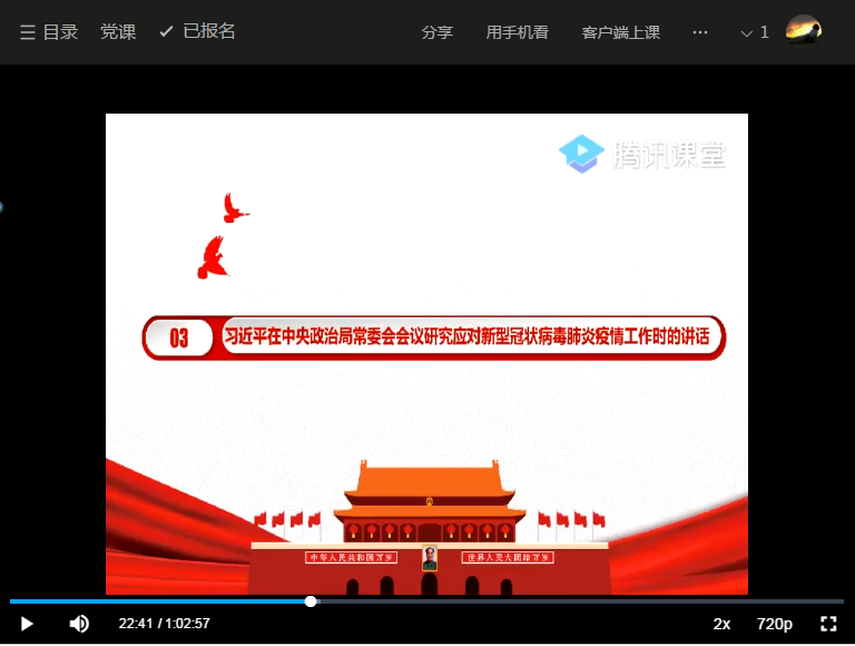 [经管公司 讯]为深入学习贯彻习近平总书记关于疫情防控工作的重要讲话和指示批示精神,在疫情防控工作中进一步发挥基层党组织战斗堡垒作用和党员先锋模范作用。根据公司党委工作安排,3月25日下午,英国威廉集团官网人力资源管理专业员工党支部代理书记王嘉通过腾讯课堂平台,开展了以“习近平指挥战‘疫’进行时”为主题的线上党课教育活动。本支部全体党员参与了活动。